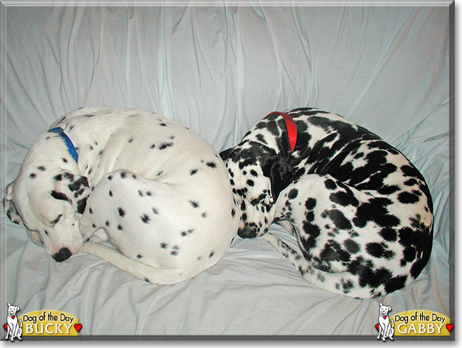 Gabby and Bucky were adopted from Recycled Canines. I am an empty nester with two kids in college and didn't intend to get any more pets after the passing of my first Dalmatian, Maddie, who grew up with my children. I started fostering and fell in love with Gabby and then adopted Bucky about six months later. They are my Yin and Yang. When children see them they say, "Look, one is black with white spots and one is white with black spots!!!" We are not sure of their ages as they are adopted from the rescue group, Recycled Canines - approximately three and five I would guess.